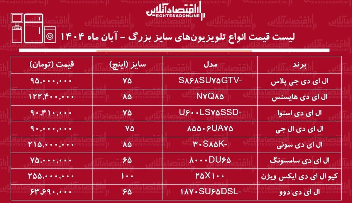 در حالیکه برندهای ایرانی همچون جیپلاس، دوو و اسنوا همچنان در محدوده قیمتی زیر ۱۰۰ میلیون تومان عرضه میشوند، برندهای خارجی مانند سونی، الجی و هایسنس نرخهایی تا بیش از ۲۰۰ میلیون تومان را ثبت کردهاند.
