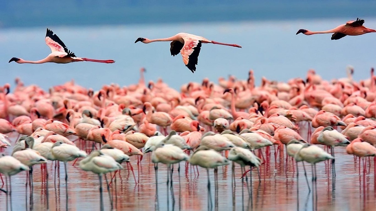 رقص فلامینگوها بر بوم رنگین دریاچه+ فیلم