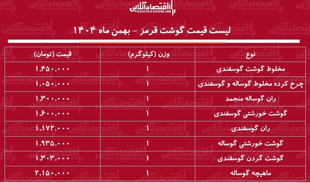 «گوشت چرخ کرده مخلوط گوساله و گوسفندی» به ازای هر کیلوگرم با قیمت ۱ میلیون و ۵۰ هزار تومان به فروش می‌رسد. همچنین، قیمت هر کیلوگرم «مخلوط گوشت گوسفندی» در بازار به ۱ میلیون و ۴۵۰ هزار تومان رسیده است.