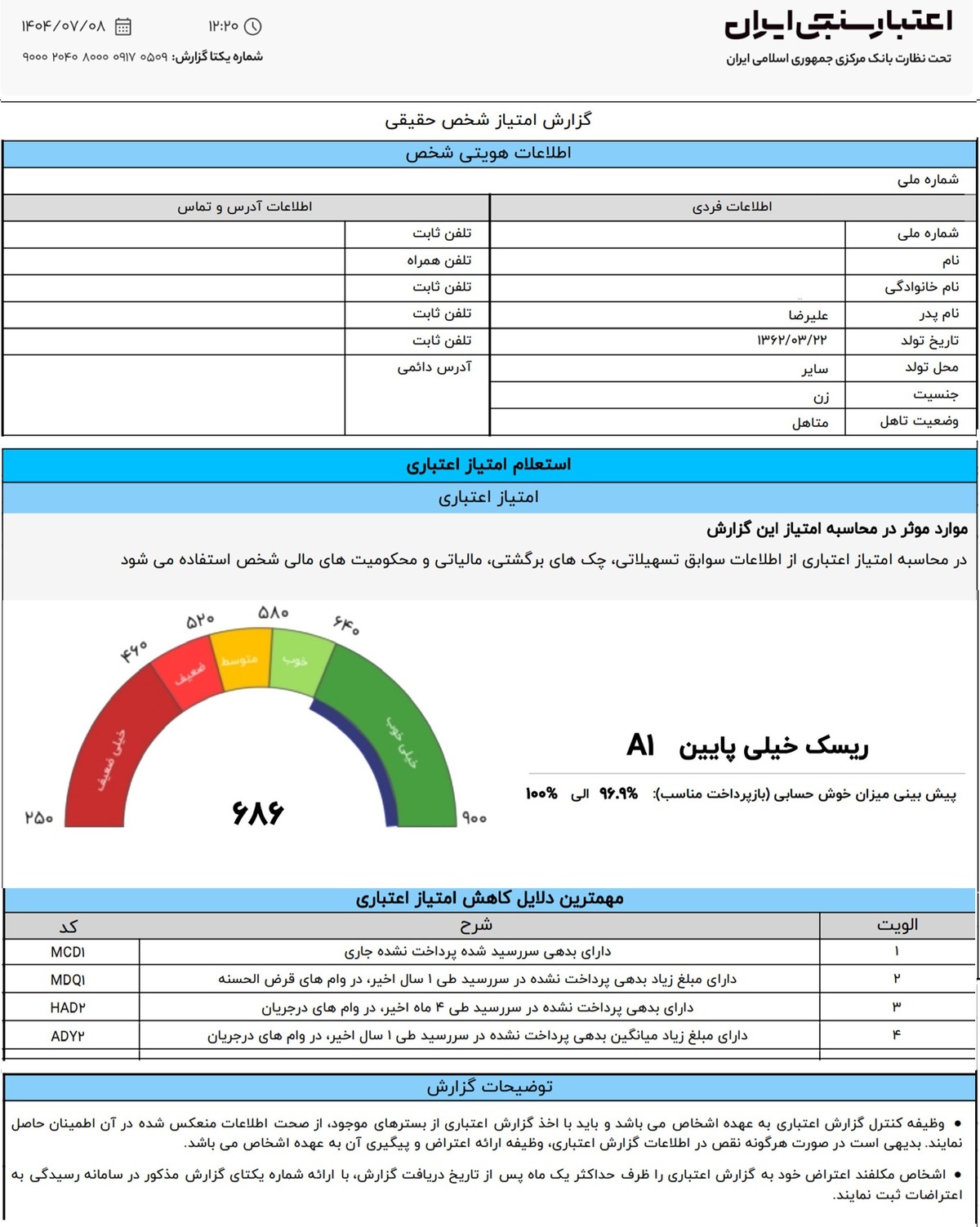 این امتیاز اعتباری حاصل وزندهی به مجموعهای از عوامل است و با هدف برآورد ریسک اعتباری آینده طراحی شده است، نه صرفاً توصیف وضعیت فعلی.