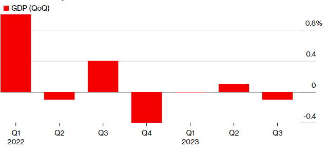 تولید ناخالص داخلی نسبت به سه ماه قبل ۰.۱ درصد کاهش یافت. مصرف بیشتر ممکن است منجر به بازگشت اندک در سال آینده شود.