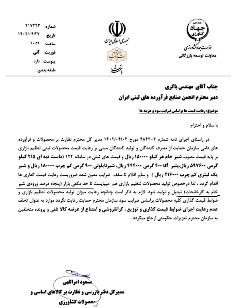 سخنگوی انجمن صنایع لبنی با اشاره به نامه ای که با امضای مدیرکل بازرسی وزارت جهاد مبنی بر اختصاص ۵۰ درصد از شیرخام دریافتی کارخانه ها به ۴ قلم کالای تعزیراتی منتشر شده، گفت: نامه ای که از سوی مدیرکل نظارت و بازرسی وزارت جهاد منتشر شده با مصوبات قبلی این وزارتخانه در تعارض آشکار است؛ در حالی که نامه ۶/۴/۱۴۰۱ معاون بازرگانی وقت وزارت جهاد خواهان اختصاص «تا۵۰ درصد از تولیدات کارخانه ها به حد مکفی» به ۴ قلم کالای لبی است اما آقای امرالهی خواستار اختصاص «۵۰ درصد از شیرخام دریافتی کارخانه ها» به ۴ قلم شده که فاقد اعتبار کارشناسی است و ضرایب تبدیل شیرخام به محصولات را در نظر نگرفته است.