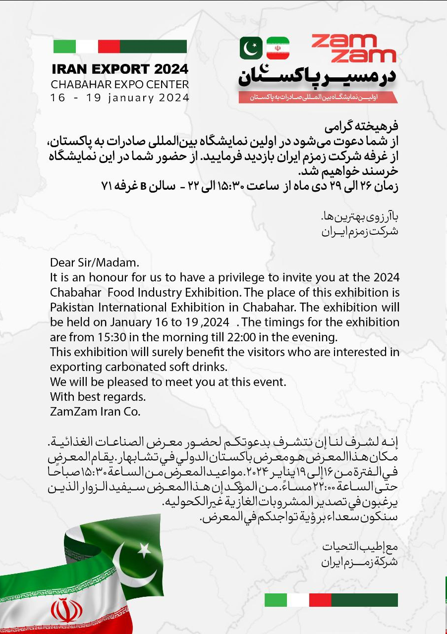 حضور زمزم در اولین نمایشگاه بینالمللی توانمندیهای صادراتی ایران به پاکستان