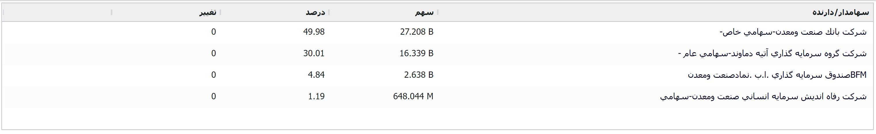 بانک صنعت و معدن و گروه سرمایهگذاری آتیه دماوند از سهامداران عمده شرکت سرمایهگذاری صنایع شیمیایی ایران هستند: