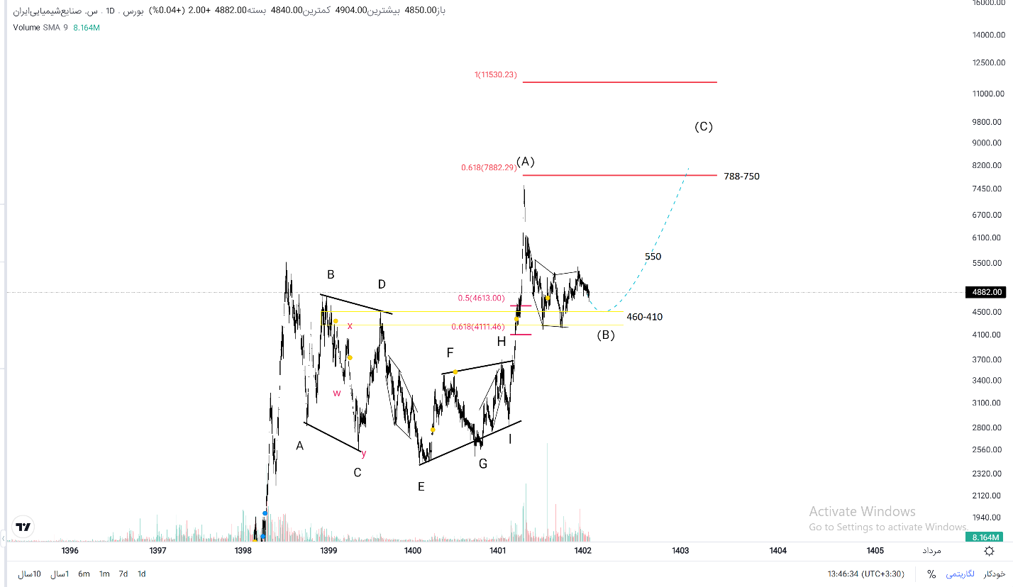 پس از تکمیل سمیترکی زمان بر از ۹۹ تا اواخر ۱۴۰۱ شاهد پساالگویی شارپی تحت عنوان A از الگوی جدید بوده ایم و سهم از کف ۲۸۰ به محدوده پیک تاریخی ۷۵۰ تومان رسیده است. سپس از اردیبهشت تاکنون یک دیامتریک را تکمیل میکند و اواخر الگو هستیم. انتظار داریم یکی دو هفته دیگر در صورت مثلث نبوده لگ g، با رعایت حد حمایت ۴۱۰-۴۶۰ تومان رشد موج صعودی بعدی C اغاز گردد.