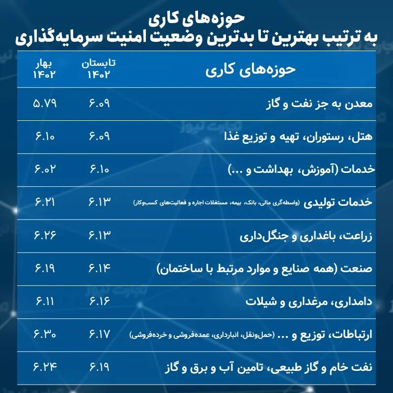 ارزیابی هفت هزار و ۸۱۲ فعال اقتصادی در کنار دادههای آماری رسمی از آن حکایت دارند که امنترین حوزه کاری برای سرمایهگذاران در تابستان سال ۱۴۰۲ بخش «معادن به جز نفت و گاز» بوده است. طوری که این بخش در کنار حوزه «هتل، رستوران، تهیه و توزیع غذا» با ثبت شاخص ۶.۰۹ عملکردی بهترین وضعیت را در بین کسبوکارهای دیگر به ثبت رساندهاند. همچنین حوزه «خدمات» نیز به شاخص ۶.۱۰ واحدی در رده سوم قرار دارد.
