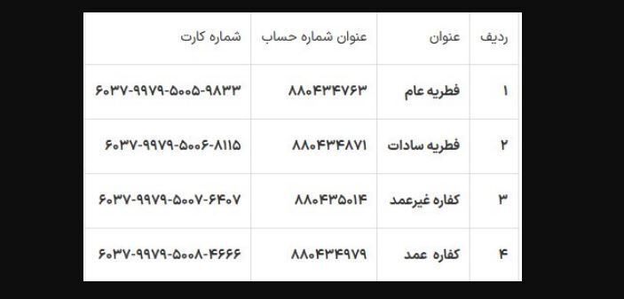 معاون توسعه مشارکتهای مردمی کمیته امداد همچنین شماره کارت در نظر گرفته شده برای فطریه را به شرح زیر اعلام کرد: