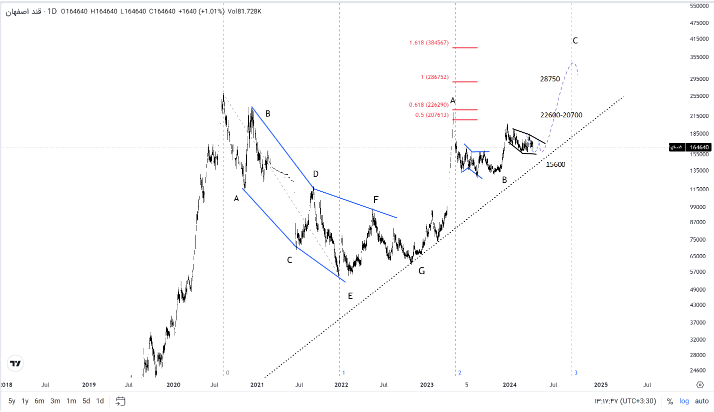 حمایت معتبری در ۱۵۶۰۰ تومان دارد و در میانه موج صعودی C است که با شتاب کمتری نسبت به A رخ خواهد داد. مقاومت های مهم ۲۲۶۰۰-۲۰۷۰۰ تومان در وهله اول و سپس ۲۸۷۵۰ است که نمودار تعدیلی بعد از افزایش سرمایه به روز خواهد شد.
