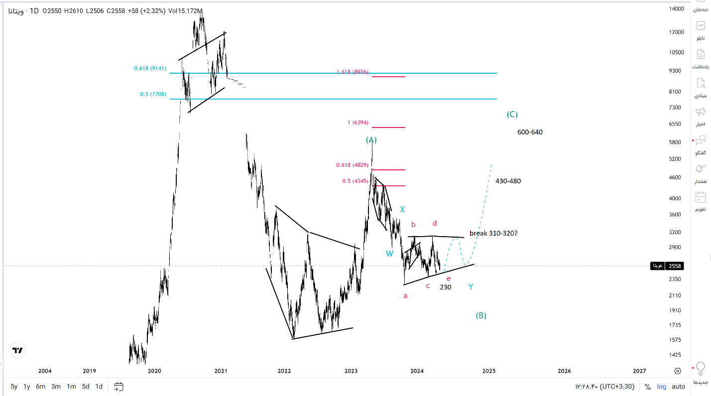موج B که از اردیبهشت ماه سال گذشته شروع شده به صورت ترکیبی در حال تکمیل بخش دوم هست که اگر دیامتریک باشد (به نظر میرسد با توجه به وضعیت کنونی بازار که از عدم نقدینگی رنج می برد) این بخش هنوز تمام شده است و هر رشدی یک نوسان مثبت هست. حمایت قوی 230 و مقاومت مهم 320 تومان می باشد که شکست این محدوده مهم است. پس از تکمیل این بخش y، یک رشد خوب برای تکمیل C داریم.