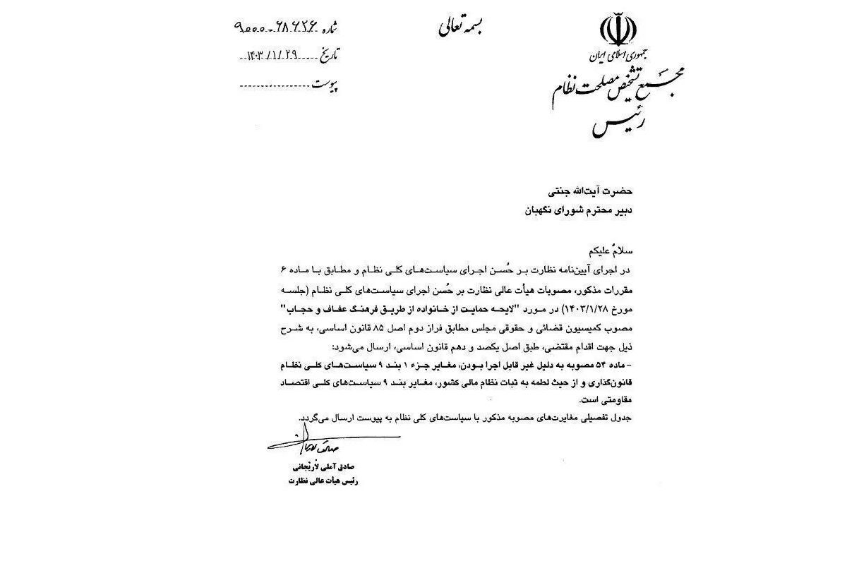 به گزارش اقتصادآنلاین به نقل از شرق، رییس مجمع تشخیص مصلحت نظام به عنوان رییس هیات عالی نظارت بر اجرای سیاستهای کلی نظام، به جنتی دبیر شورای نگهبان نامه نوشته و مصوبه مجلس درباره حجاب اجباری را مغایر با سیاستهای کلی نظام در حوزه اقتصاد مقاومتی دانسته است.
