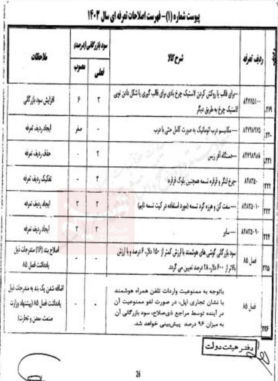 همچنین در ردیف ۲۲۵ این مصوبه، سود بازرگانی گوشیهای هوشمند کمتر از ۱۵۰ دلار، ۶ درصد و بالای ۶۰۰ دلار، ۲۸ درصد تعیین شده است.