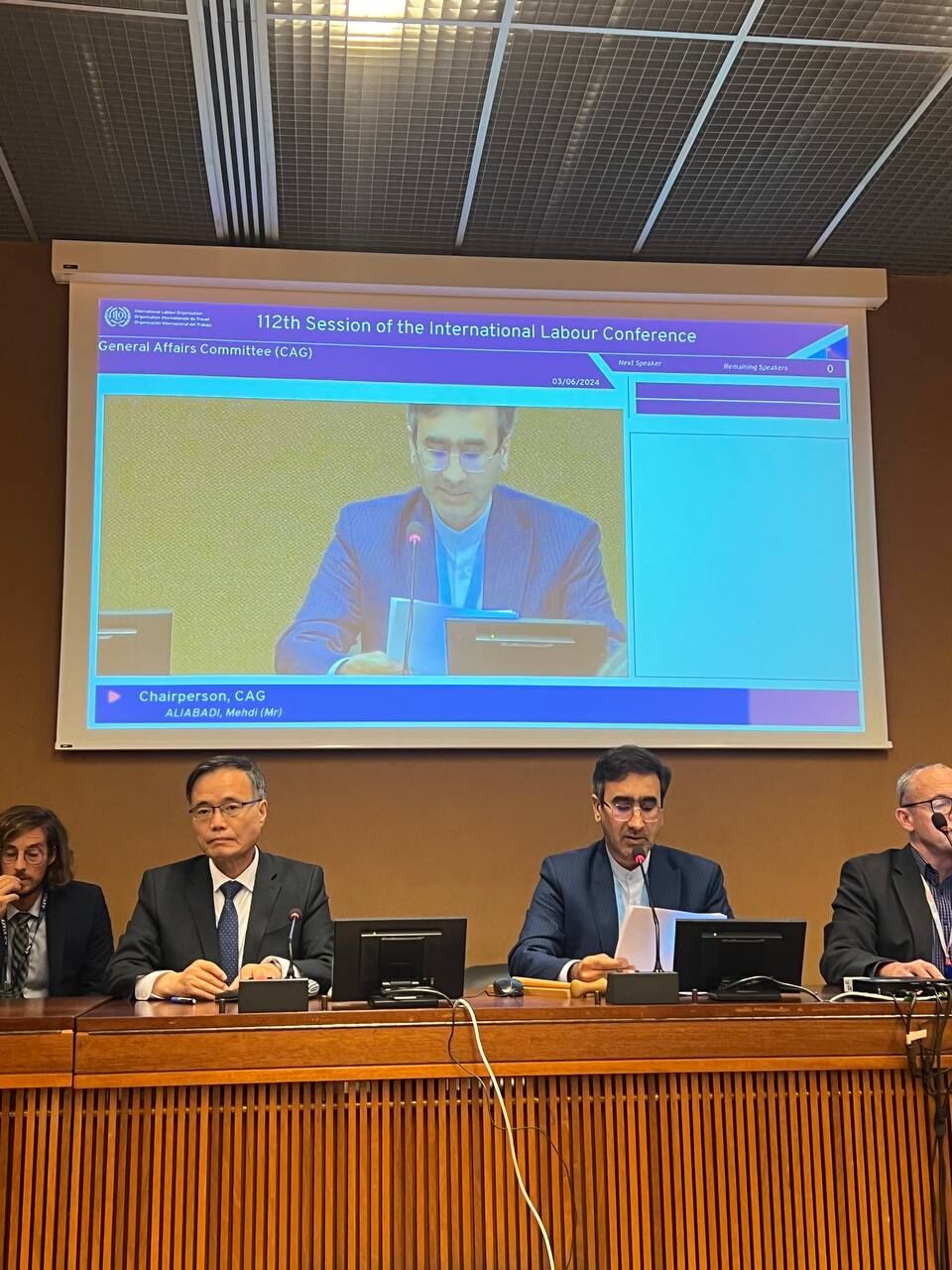 مهدی علی آبادی معاون نمایندگی ایران در ژنو به انتخاب دولتهای عضو سازمان بین المللی کار (ILO) رئیس کمیته امور عمومی ۱۱۲ امین کنفرانس بین المللی کار شد.