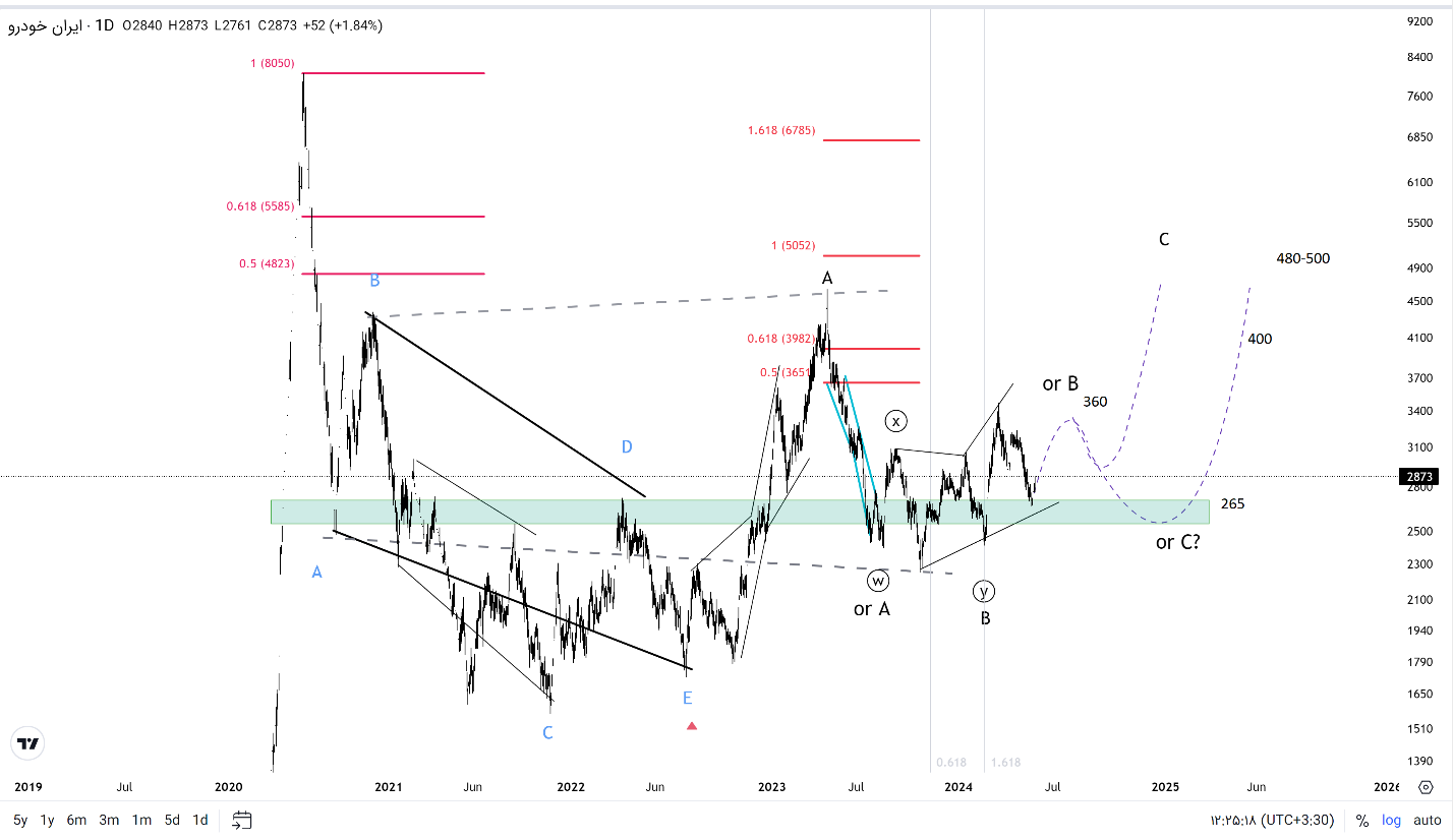 اگر الگوی ترکیبی B تمام شده باشد در موج صعودی میان مدت C هستیم. در این صورت با رعایت حد حمایت 265 تومان هدف های 360-400 پیش روست.