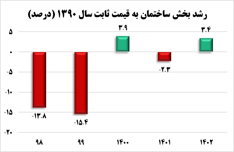 سهم بخش ساختمان در تولید ناخالص داخلی در سال ۱۴۰۰ بالغ بر مثبت ۳.۹ درصد شد اما مشخص نیست چرا در سال ۱۴۰۱ این عدد مجددا منفی شد. سهم بخش ساختمان در سال ۱۴۰۱ به منفی ۲.۳ درصد رسید.