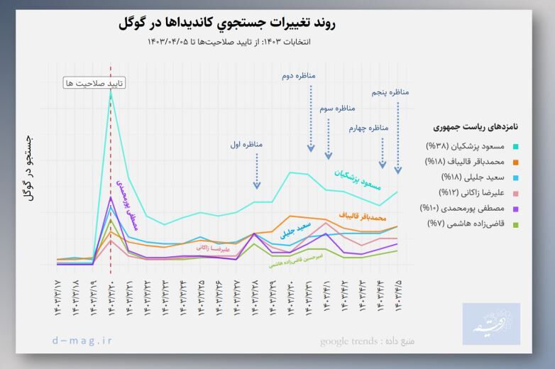 همچنین در ۵ تیر ۱۴۰۳ وضعیت همه کاندیداها به جز زاکانی در گوگلترندز با رشد همراه بوده است. مقدار رشد جستجوی پزشکیان در مقایسه با دیگر کاندیداها بیشتر بوده است که میتواند با مهمترین خبری که در این روز در کارزار انتخاباتی این نامزد دست به دست شد یعنی اعلام حمایت محمد خاتمی مرتبط باشد. رشد مستمر جلیلی نیز در روزهای اخیر قابل توجه است. تغییر و تحولات کارزار انتخاباتی نامزدهای ریاست جمهوری ایران در موتور جستجوی گوگل در روزهای اخیر در شکل زیر قابل مشاهده است.