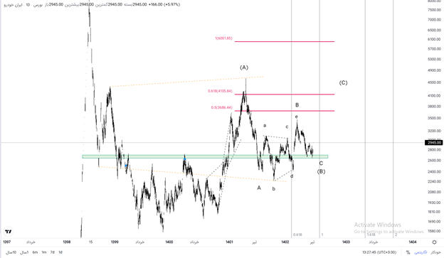 بعد از رسیدن قیمت به این ناحیه حمایتی در خرداد سال 1400 ، قیمت مدت 1.5 سال در محدوده 160 الی 270 تومان نوسان کرد و در ادامه شاهد جهش قیمتی تا تراز 161.8 درصدی app موج قبل بودیم. عد از رالی آبان 1401 که تا اردیبهشت سال گذشته هم ادامه داشت ، قیمت مجددا وارد فاز اصلاحی شد و از حوالی 460 تومان تا محدوده 225 - 230 تومان عقب نشینی داشته است.