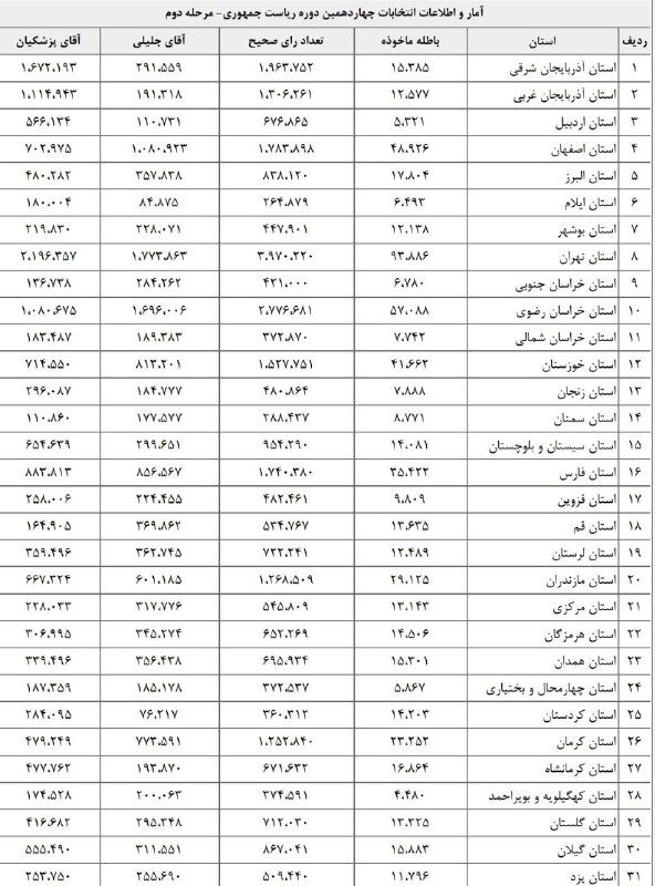 ستاد انتخابات کشور، آمار و میزان آرای نامزدها به تفکیک استانهای سراسر کشور در مرحله دوم انتخابات چهاردهمین دوره ریاست جمهوری را اعلام کرد.