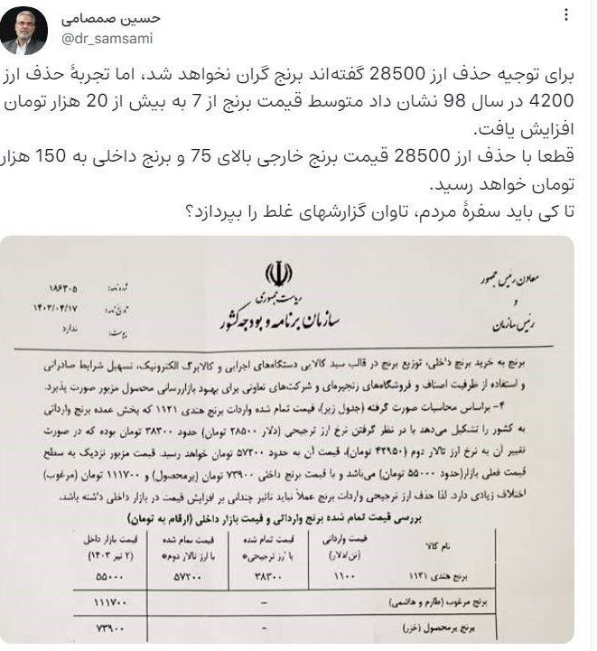 به گزارش اقتصاد آنلاین به نقل از تسنیم،‌ حسین صمصامی عضو کمیسیون اقتصادی مجلس، در واکنش به مکاتبه رئیس سازمان برنامه و بودجه در خصوص وضعیت برنج بعد از حذف ارز ۲۸۵۰۰ تومانی نوشت، برای توجیه حذف ارز ۲۸۵۰۰ تومانی گفته اند برنج گران نخواهد شد. اما تجربه حذف ارز ۴۲۰۰ در سال ۹۸ نشان داد متوسط قیمت از ۷ هزار تومان به بیش از ۱۰ هزار تومان افزایش یافت. قطعا با حذف ارز ۲۸۵۰۰ تومانی قیمت برنج بالای ۷۵ هزار تومان و برنج داخلی به ۱۵۰ هزار تومان خواهد رسید.